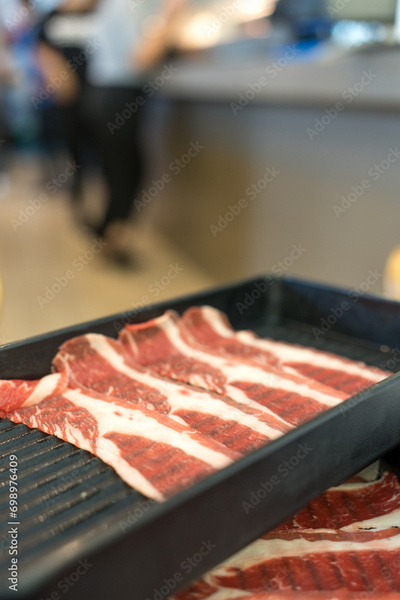 Premium beef slice on black tray for hot pot or grill. Barbecue or yakiniku main ingredients.