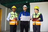 workers or engineers planning from work on blueprint drawing paper in the factory