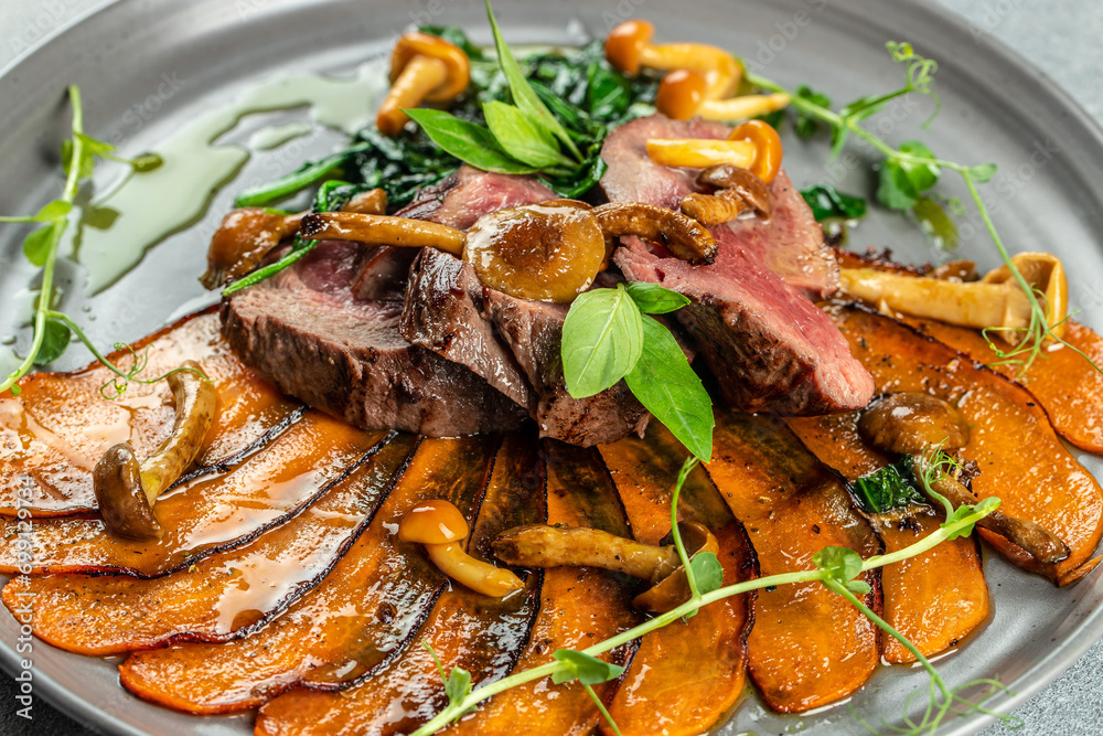Spicy veal steak roasted served with baked potato, fresh greens on a light background top view. copy space for text