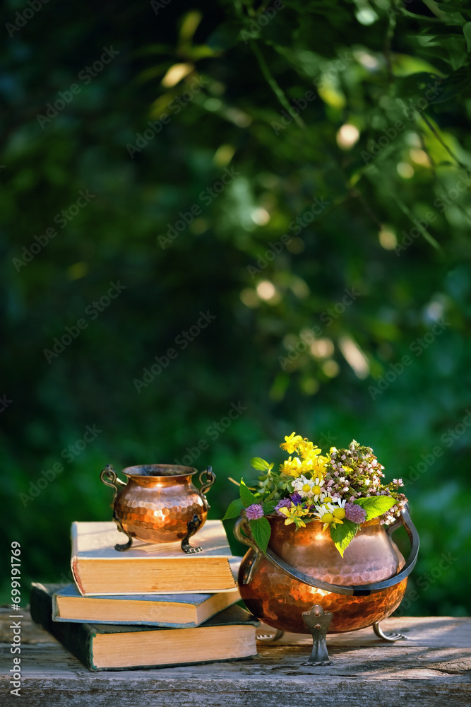 witch cauldrons with herbs and flowers, spell books on table outdoor, abstract natural background. Magic Ritual. witchcraft. esoteric ritual, witchcraft. spiritual practice with sacred healing plants