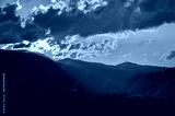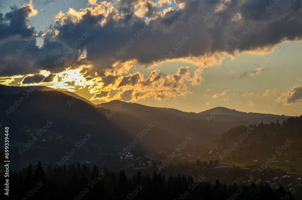Sunset sun's rays over distant mountain peaks illuminate the beautiful panorama of the Carpathian village in the valley