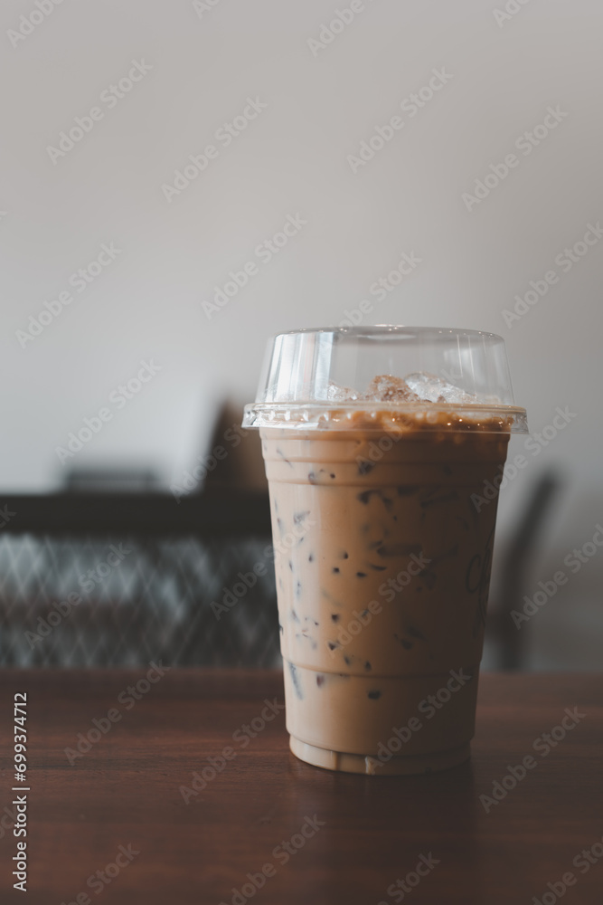 Iced Mocha coffee in plastic take away cup placed on wooden table at cafe