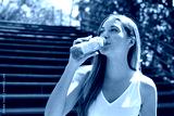 Beautiful healthy young woman drinking green smoothie detox juice outdoors
