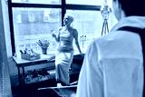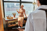 cheerful mature model posing with wine glass near blurred woman artist in modern art studio