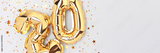 Banner with number 20 gold colored balloons with stars confetti on a blue background. Place for text.