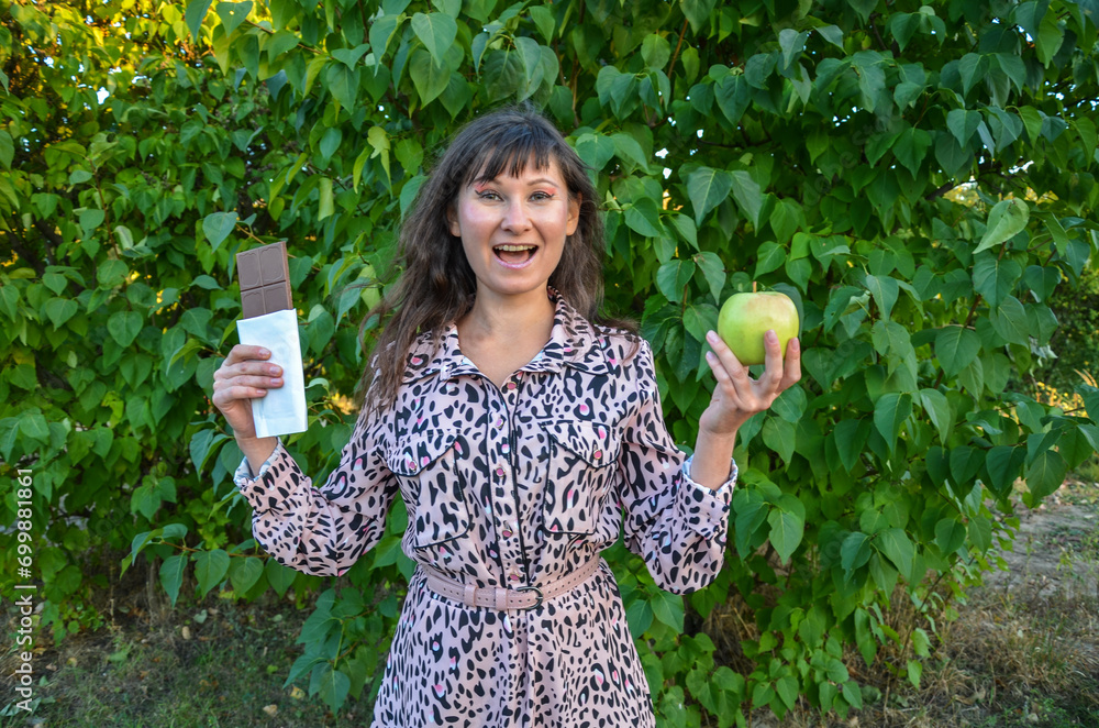 Pleased girl with chocolate and green apple in the hands. Choice between sweet and healthy food