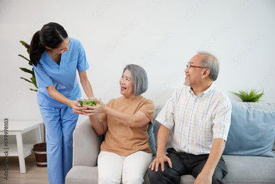 nurse or caregiver serving vegetables in a bowl to senior couple on sofa