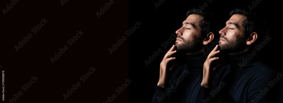 Collage two portraits of young adult man before and after rejuvenation procedure Face skin aging process Appearance of Rough skin and smooth skin Use for advertising of skin care and product of man