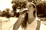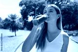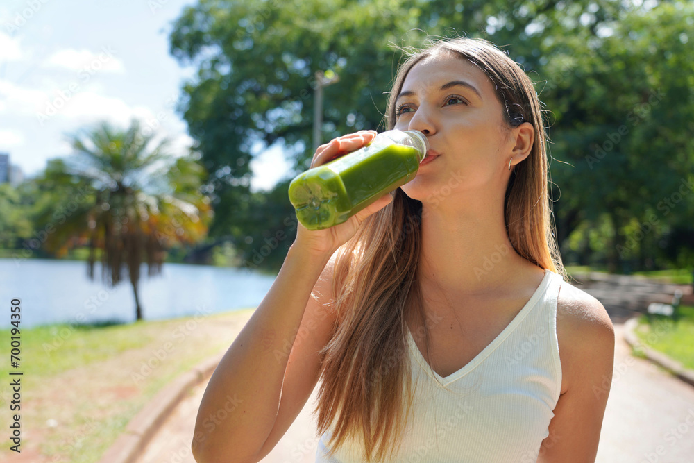 Healthy fitness girl drinking green smoothie detox juice with kiwi mint kale in city park
