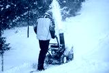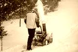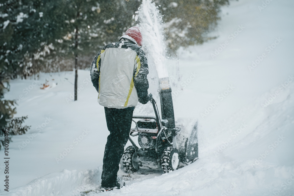 A snowy suburban scene with a man using a snowblower to clear the sidewalk. A man clears the snow from the street with a powerful snowblower after a heavy winter storm. Winter season work outside.