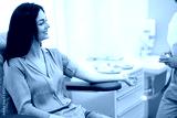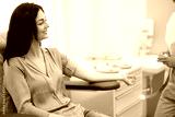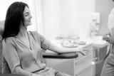 Exhausted woman is waiting for blood tests to be taken while sitting in the laboratory