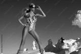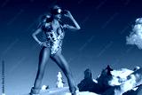 Sexy blonde girl wearing glamour sequin silver mirror bikini and winter fashionable boots is posing on a sunny day in the mountains.