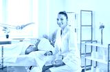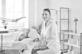 Portrait of a smiling skin care professional. Female beautician or cosmetologist at work. Happy young woman in a white coat sitting by a bed with her client and magnifying lamp