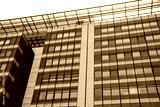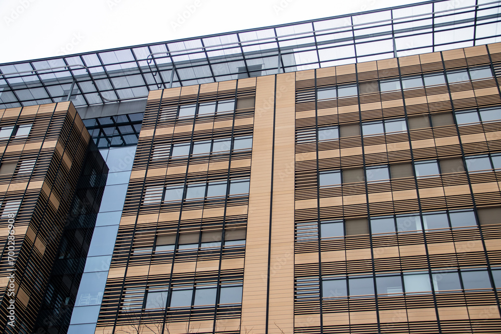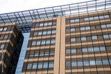 Urban metropolis modern architecture. Exterior with glass walls, reflecting surrounding buildings. Brand new buildings for business and office purposes