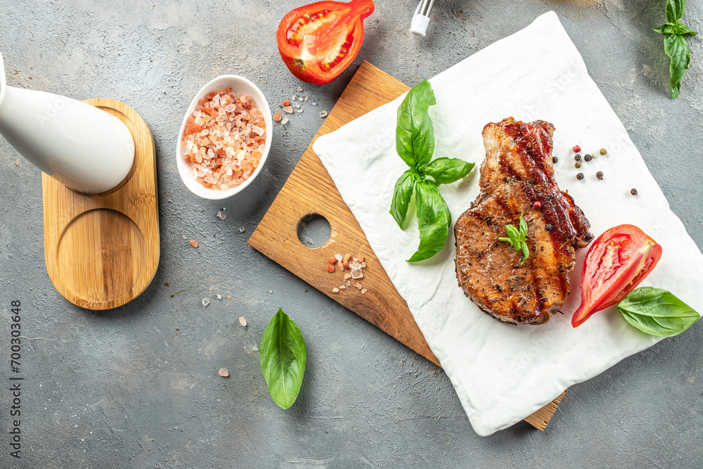 Delicious juicy grilled pork steak on a light background. Restaurant menu, dieting, cookbook recipe top view