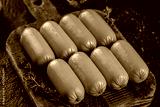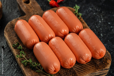 Fresh raw sausages on a wooden board, top view, Ingredients for hot dogs