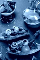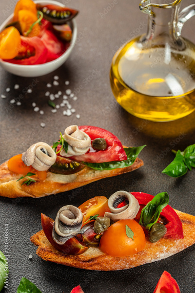 Bruschetta with marinated anchovies, fresh tomato, olive oil. Delicious spanish tapas. banner, menu, recipe place for text, top view