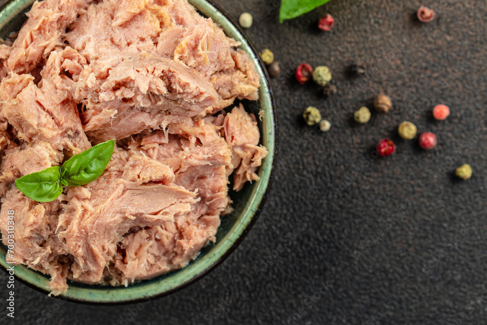 Canned tuna steak in brine on a dark background. Restaurant menu, dieting, cookbook recipe top view