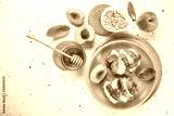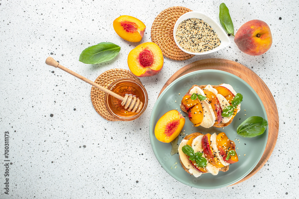 Healthy salad with fresh cheese and peaches on toast. Healthy food concept. place for text, top view