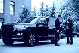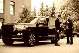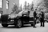 Male driver helps a business lady to get in a car, opening door of a luxury SUV taxi. Business lady with handbag wearing black formal wear. Concept of transportation service