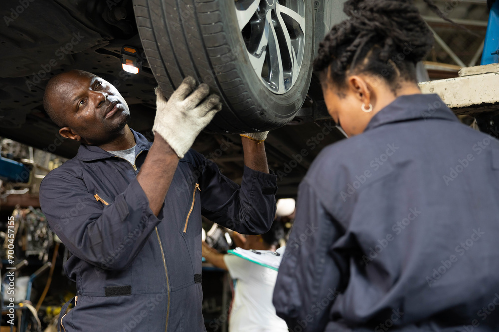 African mechanic workers fixing and checking a car or tire in automobile repair shop