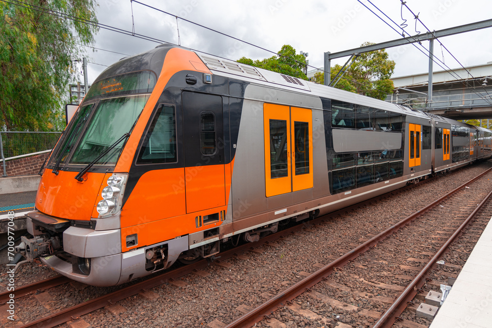 Commuter Train fast moving through a Station in Sydney NSW Australia locomotive electric light rail