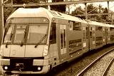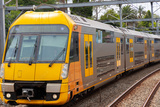 Commuter Train fast moving through a Station in Sydney NSW Australia locomotive electric light rail