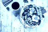 full english breakfast fried eggs, roasted sausages, tomatoes, mushrooms and vegetables on a wooden background. place for text, top view