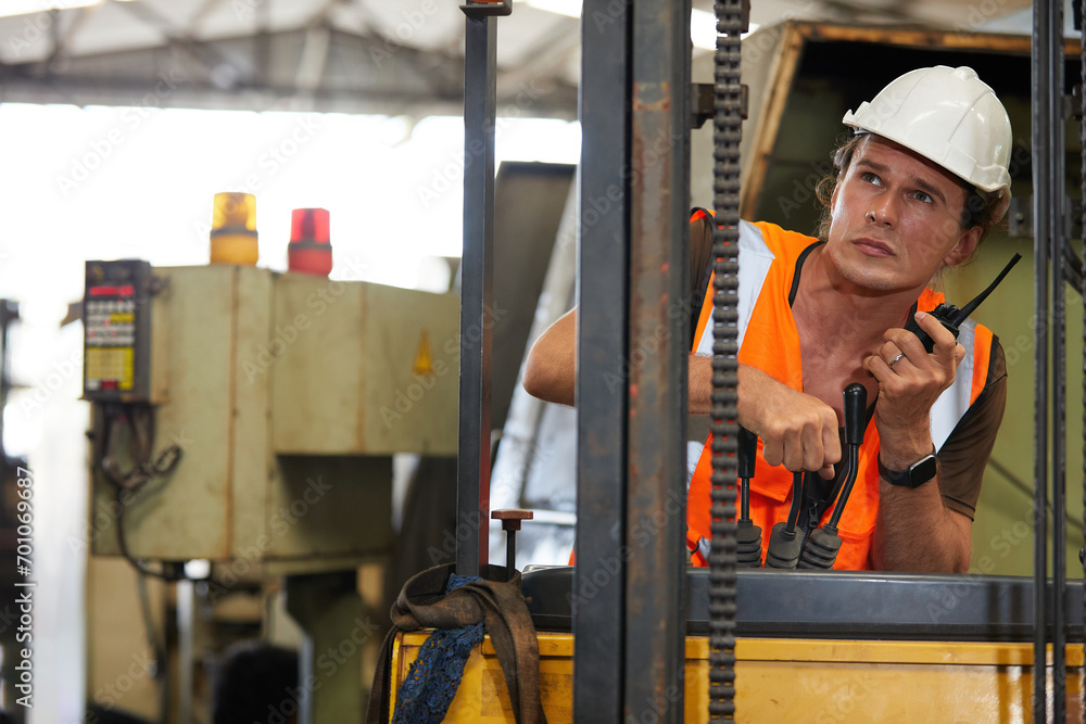 factory worker using walkie talkie and holding steering wheel on forklift truck