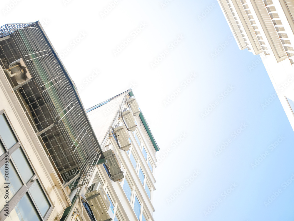 Typical caged-balcony apartment and multistory residential houses at small back alley in downtown Hanoi, Vietnam, lookup view dense condo high-rise office building block urban