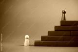 A wooden peg doll stands on the step, a metaphor for career advancement. Concept of higher social status, business strategy, HR. Ladder career path concept. Copy space