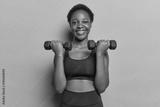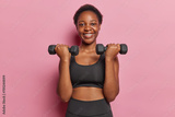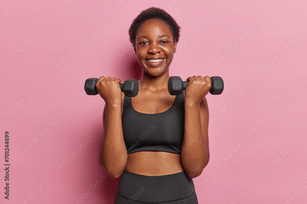 Active slim woman dressed in black cropped top and leggings lifts dumbbells being in good physical shape smiles pleasantly isolated over pink background doing biceps curl. Healthy lifestyle concept