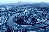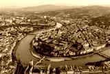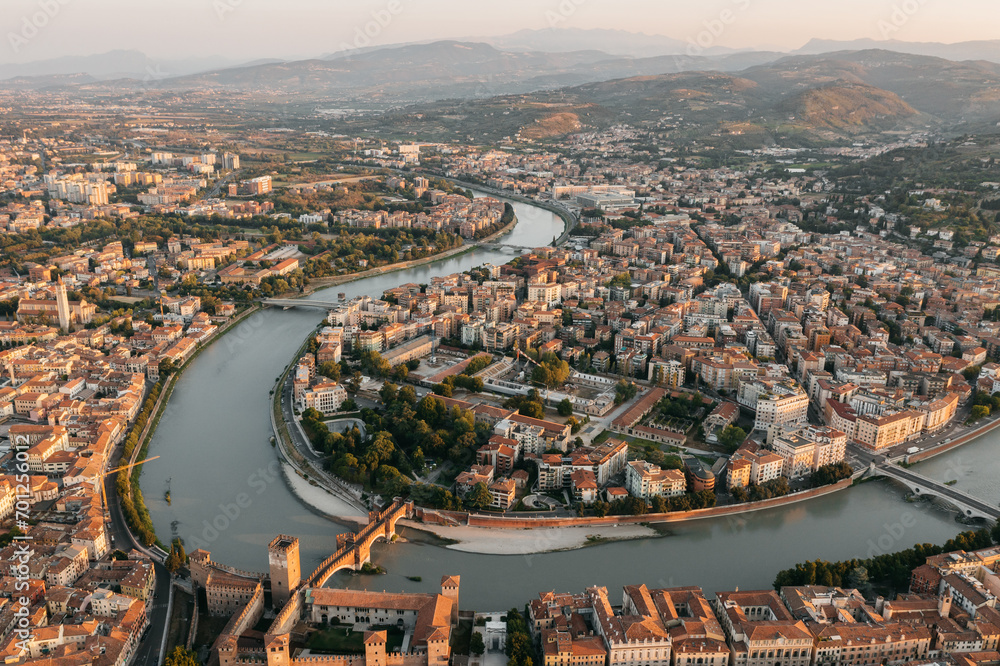 Aerial drone view of sunrise in Verona, Italy with the Adige river.
