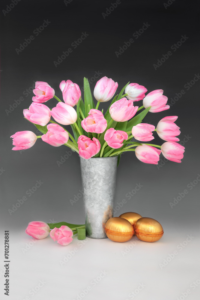 Happy Easter concept with gold eggs and pink tulip flower arrangement on gradient black white background. Spring floral and festive treats for the holiday season.