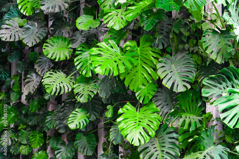 Tropical green leaves background, fern, palm and Monstera Deliciosa leaf, floral jungle pattern concept background, concrete wall vertical elements in an urban environment