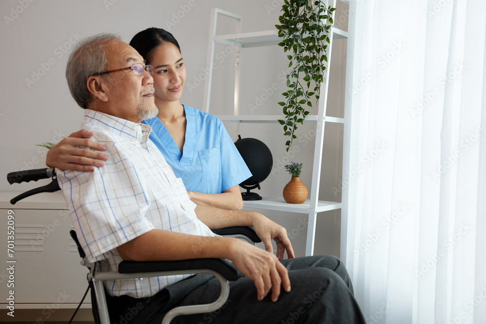 nurse or caregiver beside elderly man sitting on wheelchair and looking outside at home