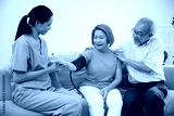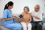 caregiver or nurse measure blood pressure to senior woman on sofa
