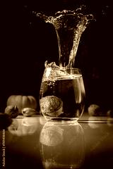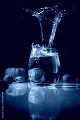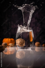 splash of walnuts in a glass filled with water on dark background. autumn ingredients in the background: pumpkin, walnuts, almonds etc.. .