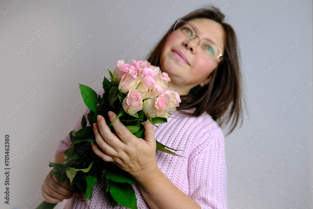 close-up of bouquet of white, pink roses, in hands of adult woman, brought flowers on date with girlfriend, boyfriend, gives to mom, concept of mother's, Valentine's day, birthday, focus in foreground
