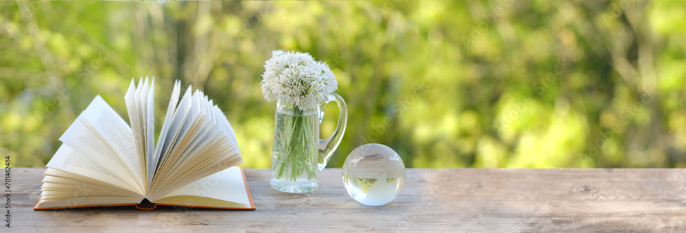 paper book, glass ball globe, bouquet of wild garlic flowers on old wooden table in garden, blurred natural landscape in background with green foliage, Ecology concept, education, energy of nature