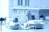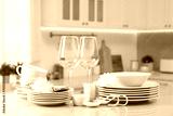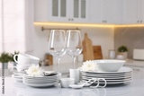 Set of clean dishware, glasses, cutlery and flowers on table in kitchen