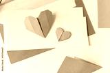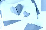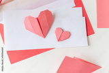 Red paper envelope with white blanks and pink origami hearts. Valentine's day concept card.