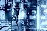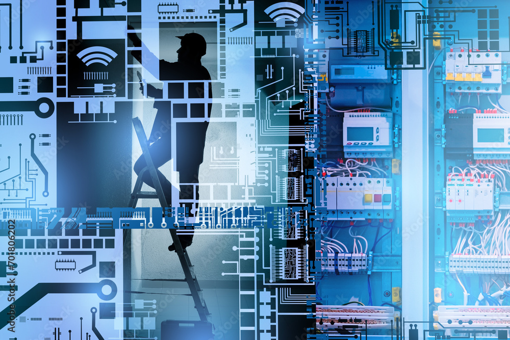 Electric installation work. Equipment for controlling electrical appliances. Silhouette of electrician on stepladder. Man is doing electrical work. High-voltage wires and circuit breakers