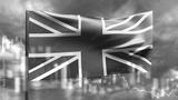 Economy of Great Britain. National flag of United Kingdom. UK economic recession chart. Great Britain financial market. Economic crisis UK. England flag in cloudy sky. UK Crisis chart. 3d image