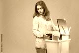 Woman with dismissal box. Depressed girl lost job. Lady with dismissal box standing on gray. Woman was fired due to bankruptcy company. Corporation manager collects dismissal box. Staff reduction