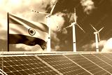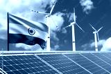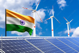 Solar panels with India flag. Power station. Wind turbines under blue sky. Solar power plant. Renewable energy in India. Eco friendly power station. Modern electric station in India. 3d image