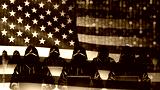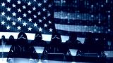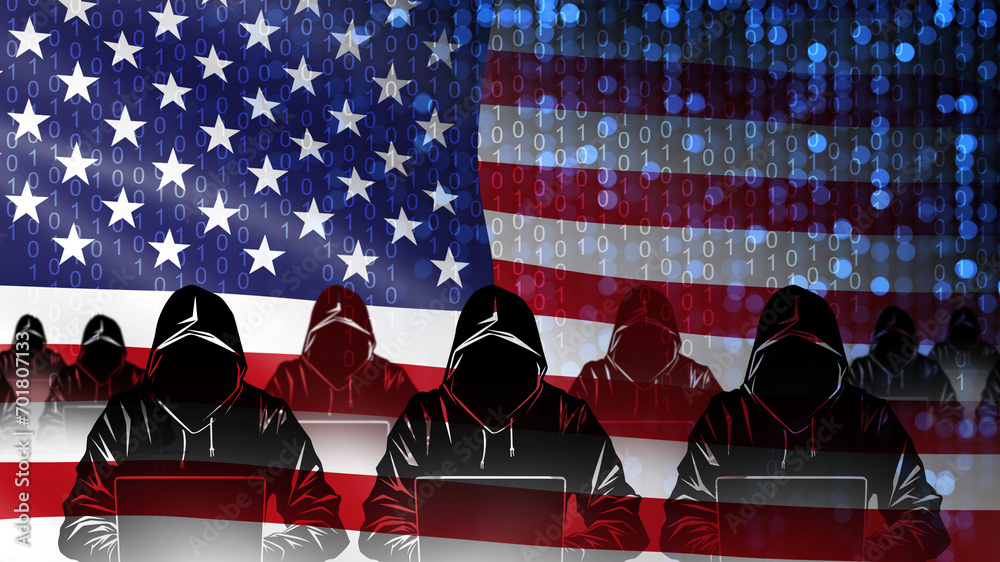 USA hacker flag. Cyber army silhouettes with laptops. Hooded people use computers. Hackers from united states. American flag with binary code. USA cyber forces. Hackers creating malware. 3d image