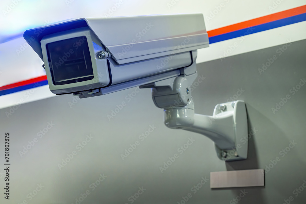 IP surveillance camera. CCTV equipment. Videcam is mounted on wall. White CCTV in vandal-proof housing. IP surveillance camera for enterprises. CCTV camera with wide viewing angle.
