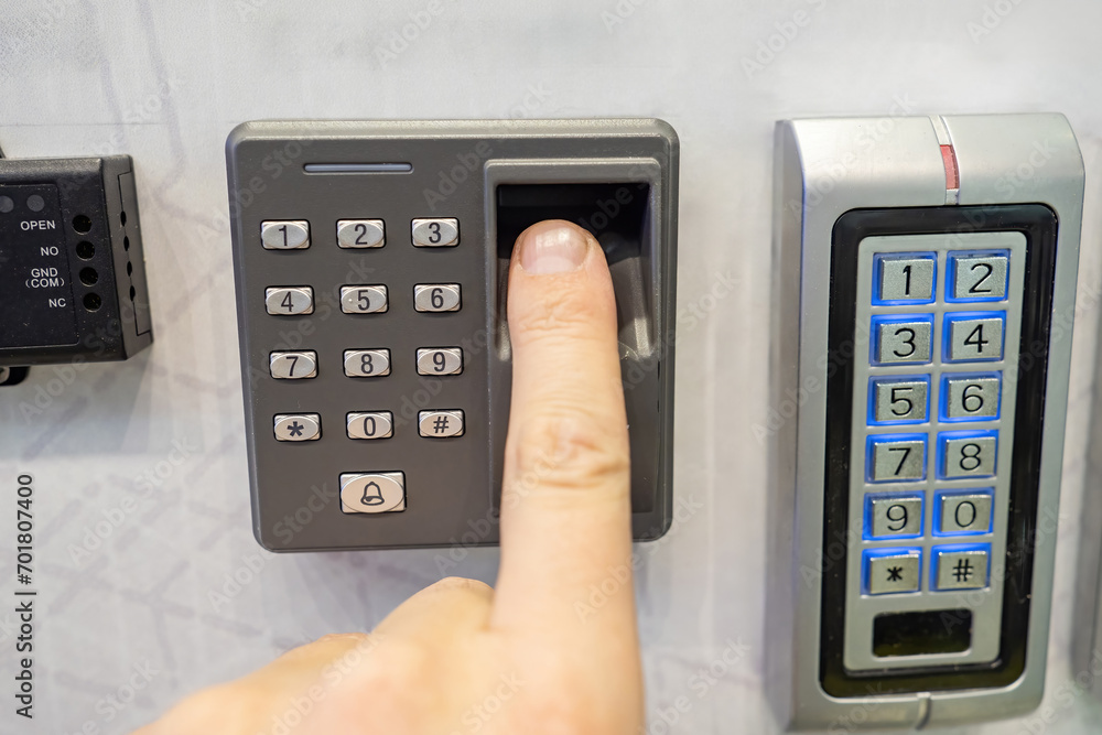 Biometric fingerprint reader. Access control equipment. Digital lock with biometric scanner. Scan your finger to gain access to safe. Enterprise access control. Biometric identification