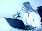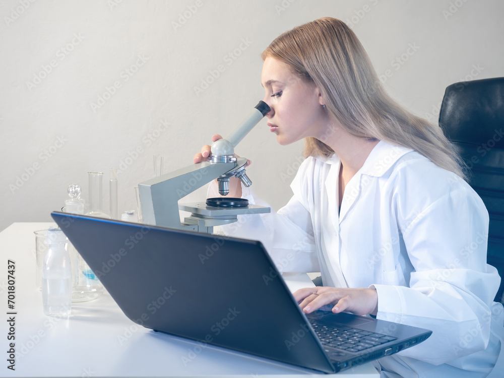 Geneticist woman. Doctor looks through microscope. Lab worker sits at desk. Geneticist uses laptop for research. Young woman geneticist. Doctor in white coat with microscope. Geneticist scientist